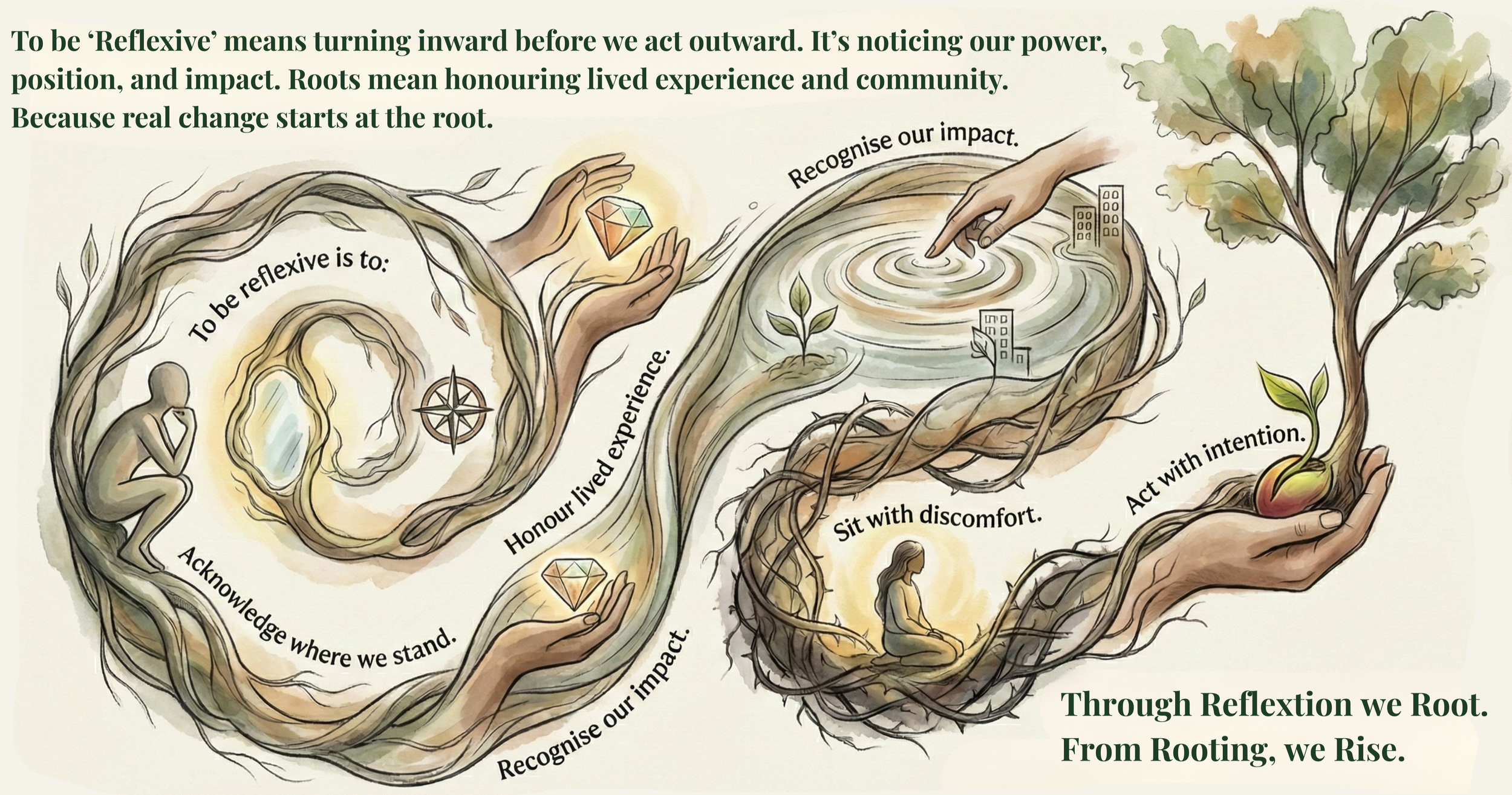 To be ‘Reflexive’ means turning inward before we act outword. It’s noticing our power, position, and impact. Roots mean honouring lived experience and community